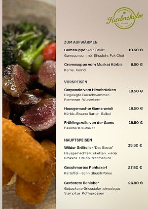 Mit gewohnt ehrlichem Charakter und Liebe zum Detail, zeigt sich die Karbachalm als Einkehr für Genießer von Natur, regionalen Gaumenfreuden und österreichischen Wirtshausklassikern. Das Ambiente vereint schon bald neue Einrichtungs – und Dekorationselemente im Gastraum mit den von vielen Gästen geschätzten, stimmigen Anklängen an vergangene Tage, die das „Urige“ nicht vermissen lassen. Die Karbachalm ist Wein- und Genusspartner von Ski amadé und Partner der Genussregion Pongauer Wild.